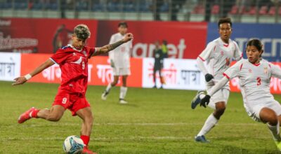 काठमाडौँ- अन्तर्राष्ट्रिय महिला फुटबल प्रतियोगिता अन्तर्गत आज नेपालले आफ्नो तेस्रो खेल म्यानमारसँग बराबरी खेलेको छ । त्रिपुरेश्वरस्थित दशरथ रंगशालामा सम्पन्न खेल