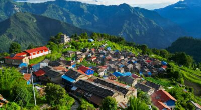 म्याग्दी । पहाडको टुप्पोमा भिरालो पाखामा मौलिक ढुङ्गेघरहरु भएको झुरुप्प बस्ति । पृष्ठभूमिमा हिमाल र वरपर अग्ला डाडापाखा । गाउँको