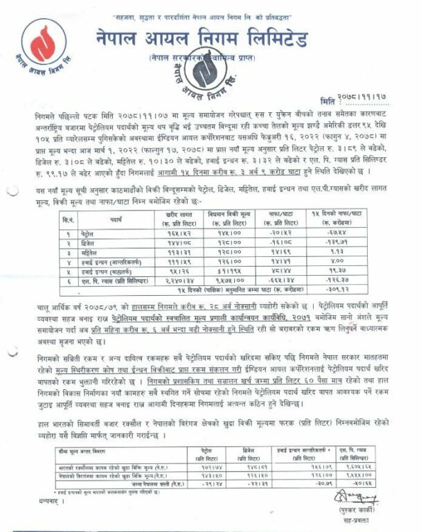 नेपाल आयल निगमले मंगलबार विज्ञप्ति जारी गर्दै अब पेट्रोलमा प्रतिलिटर २०.५२ रुपियाँ, डिजेलमा १६ रुपियाँ र एलपीजी ग्यासमा प्रतिसिलिन्डर ६६५ रुपियाँ घाटा हुने जनाएको छ । मूल्य वृद्धिको नयाँ सूची अनुसार नेपालाई मासिक छ अर्ब १८ करोड रुपियाँ घाटा हुने विज्ञप्तिमा उल्लखे छ ।