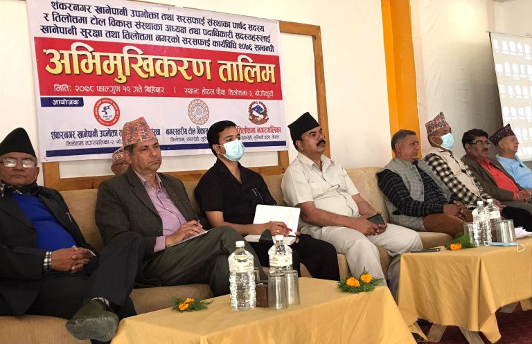 खानेपानी संस्थाका अध्यक्ष झविन्द्र भण्डारीको अध्यक्षता, उपाध्यक्ष डिलबहादुर भट्टराईको स्वागत, सचिव कमला भण्डारीको सञ्चालनमा भएको कार्यक्रममा तिलोत्तमा वडा नं ३ का वडाध्यक्ष टंकप्रसाद तिवारी, खानेपानी उपभोक्ता महासंघ रुपन्देहीका अध्यक्ष ध्रुव धिताल, नगरस्तरीय टोल विकास संस्था सञ्जालका अध्यक्ष हेमराज पौडेल, नगरपालिकाकी वरिष्ठ सामाजिक परिचालक अल्पा घिमिरे, वातावरण शाखाका गोरखनाथ खनाललगायतले बोलेका थिए ।
