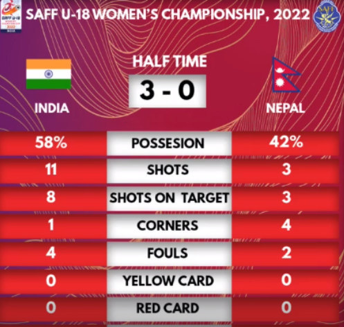 जारी खेलको पहिलो हाफ सकिँदा नेपाल तीन गोलले पछि परेको छ ।