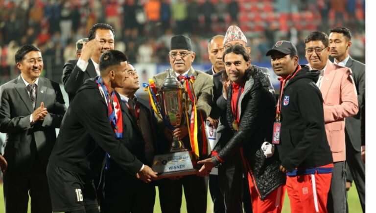 काठमाडौँ- अखिल नेपाल फुटबल सङ्घको आयोजनामा भएको प्रधानमन्त्री त्रिदेशीय फुटबल कप प्रतियोगिताको उपाधि नेपालले जितेको छ । त्रिपुरेश्वरस्थित दशरथ रङ्गशालामा आज भएको फाइनल खेलमा नेपालले लाओसलाई २–१ गोलअन्तरले पराजित गर्दै उपाधि जितेको हो ।
